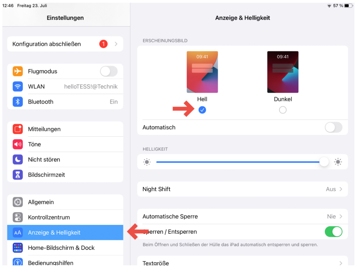 1. Gehen Sie in die Einstellungen Ihres iPads, klicken Sie links auf "Anzeige & Helligkeit" und wählen Sie dann rechts das Erscheinungsbild "Hell" aus.